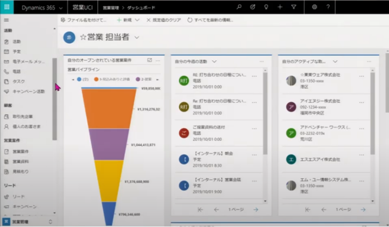 | 販売管理Dynamics365 for Sales | 顧客管理 | 商談・活動管理 | 商談ステージ管理 | 営業目標管理 | ソーシャル&顧客の声 | 営業・案件分析 | 代理店向けポータル | |