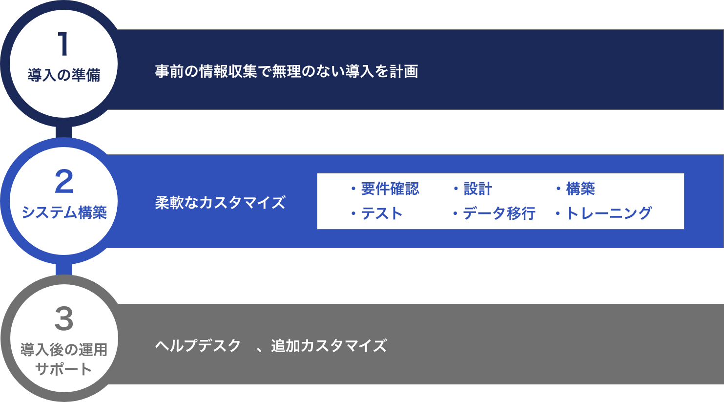 導入コンサルティング、導入設定、マニュアル作成、導入研修、保守、運用、サポート