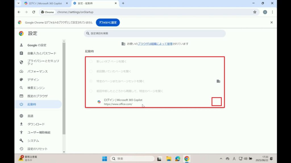 7.「起動、ホーム ページおよび新しいタブ ページ」をクリックします。