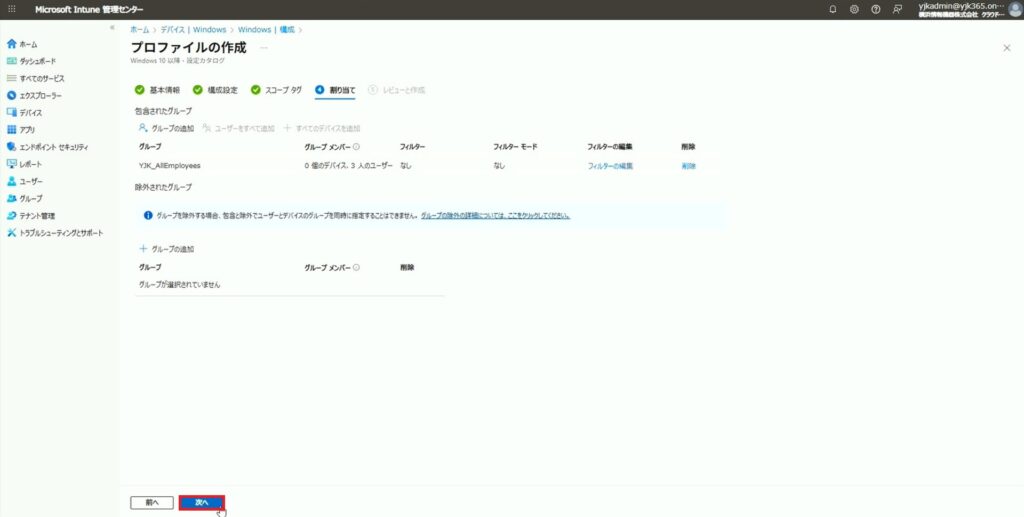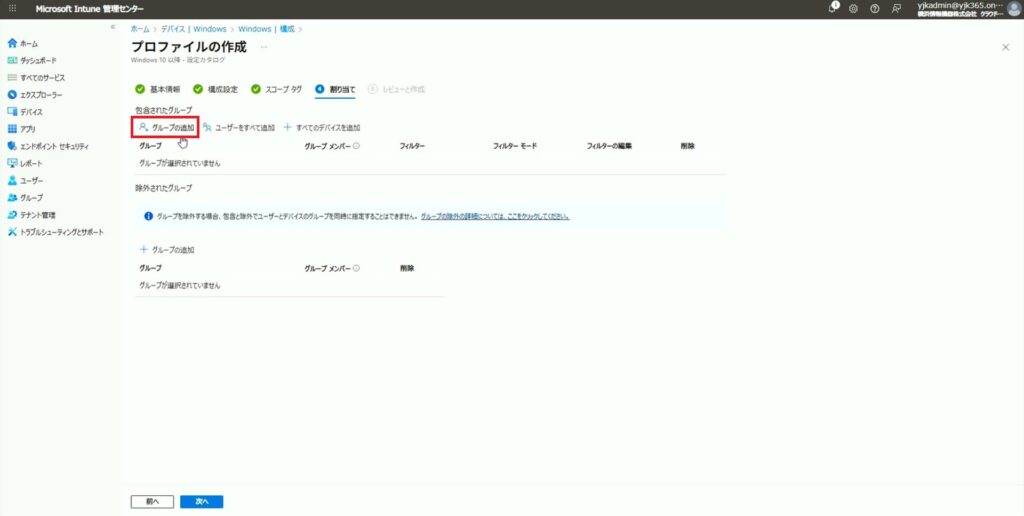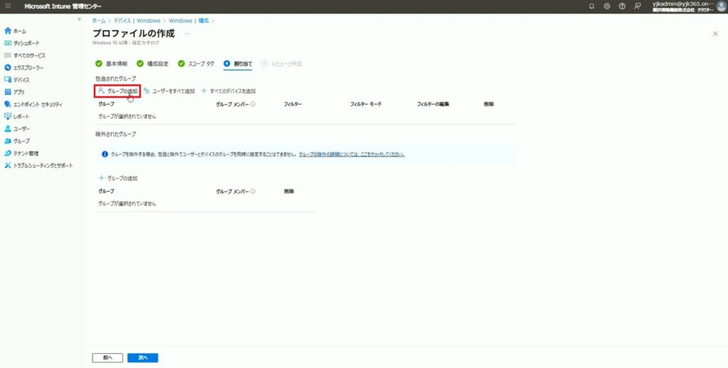 4.「プラットフォーム」のプルダウンより、「Windows 10 以降」を選択、「プロファイルの種類」のプルダウンより、「設定カタログ」を選択し、「作成」をクリックします。