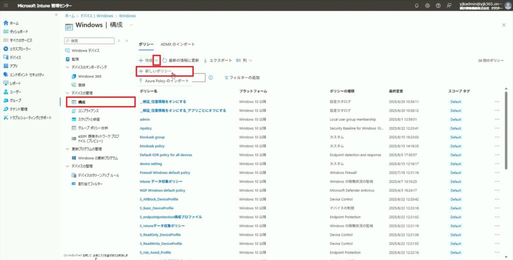 3.「構成」をクリックし、「+作成」のプルダウンより、「+新しいポリシー」を選択します。