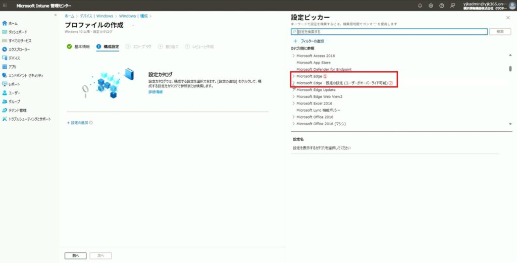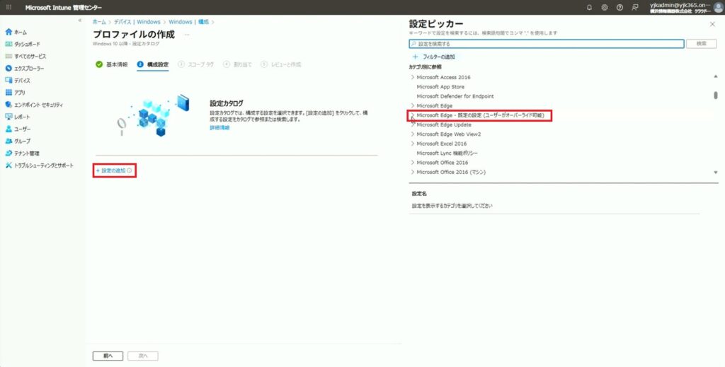 6.「 設定の追加」をクリックし、「Microsoft Edge – 既定の設定(ユーザーがオーバーライド可能)」を開きます。