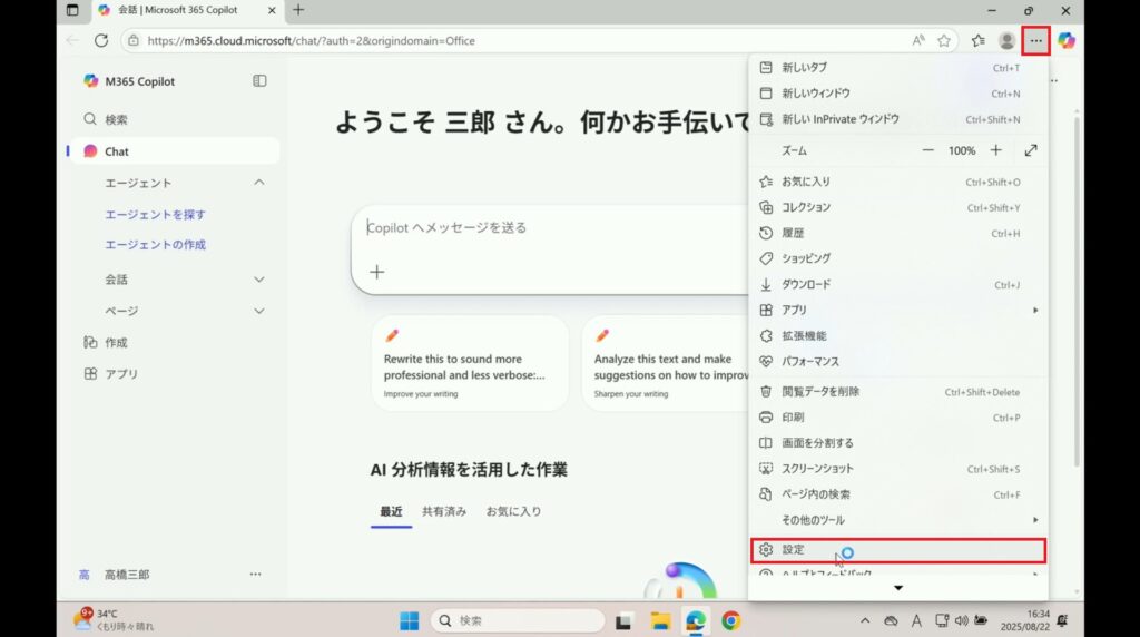 右上の「三点リーダー」をクリックし、「設定」をクリックします。