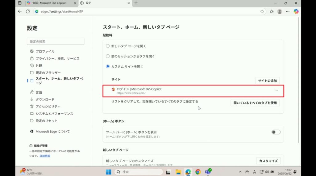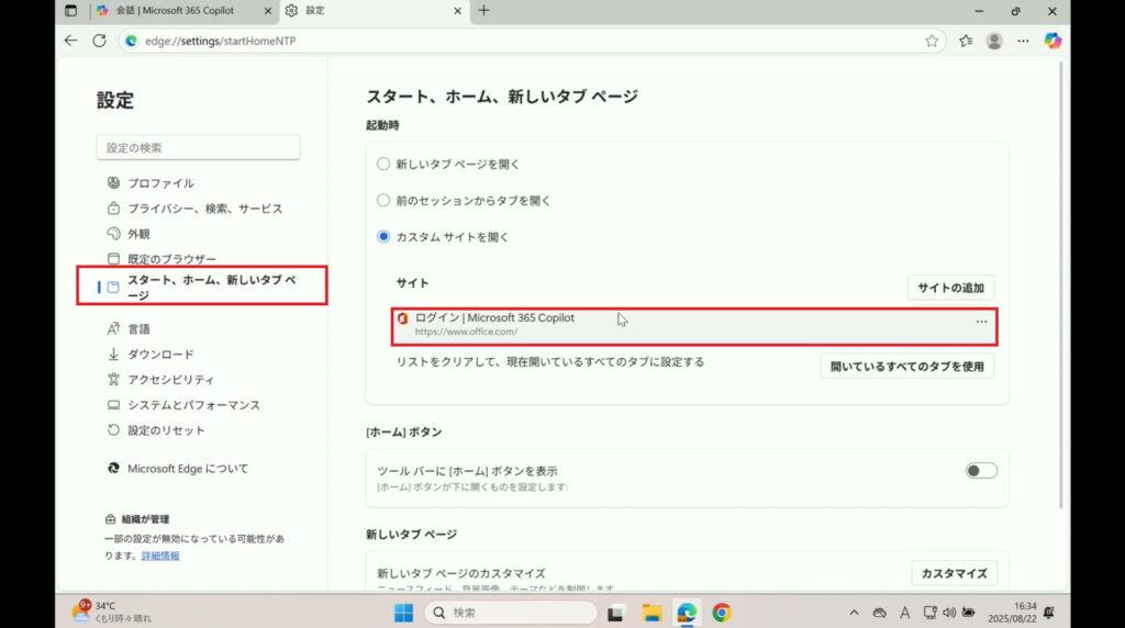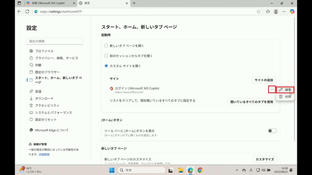 訳:Microsoft Edge の起動時に実行するアクション(ユーザー)