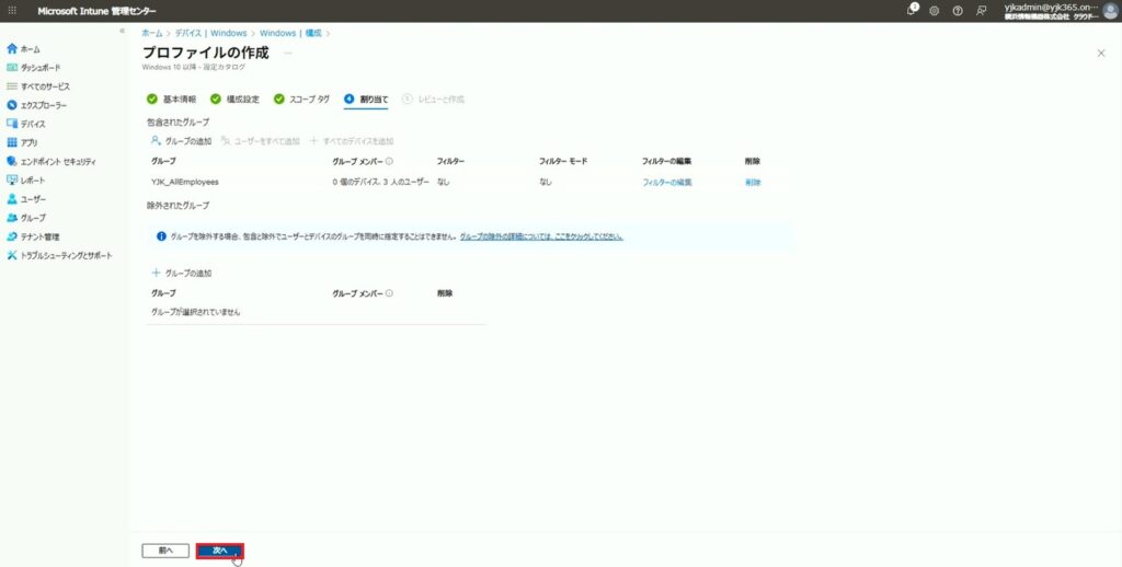2.「プラットフォーム」のプルダウンより、「Windows 10 以降」を選択、「プロファイルの種類」のプルダウンより、「設定カタログ」を選択し、「作成」をクリックします。