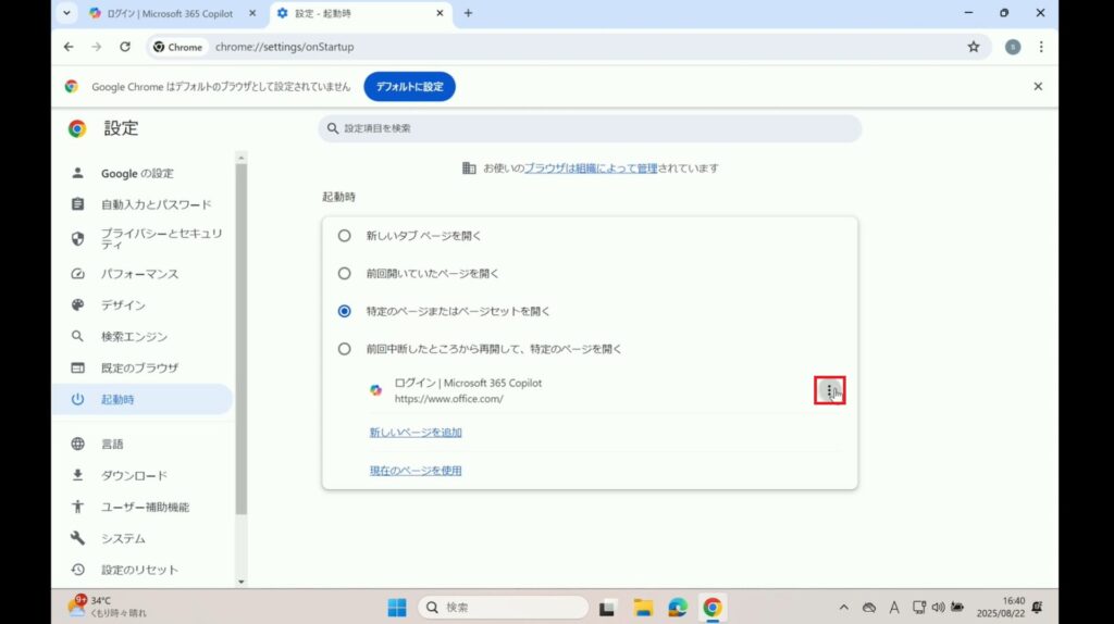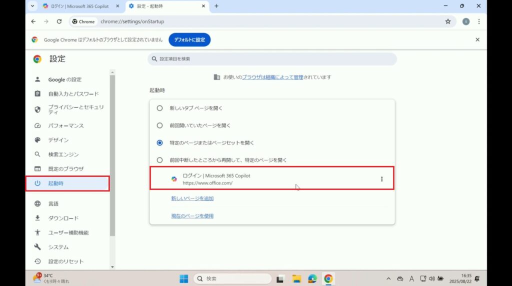 設定項目:「スタートページを指定する」(今回、こちらの設定を行います。)