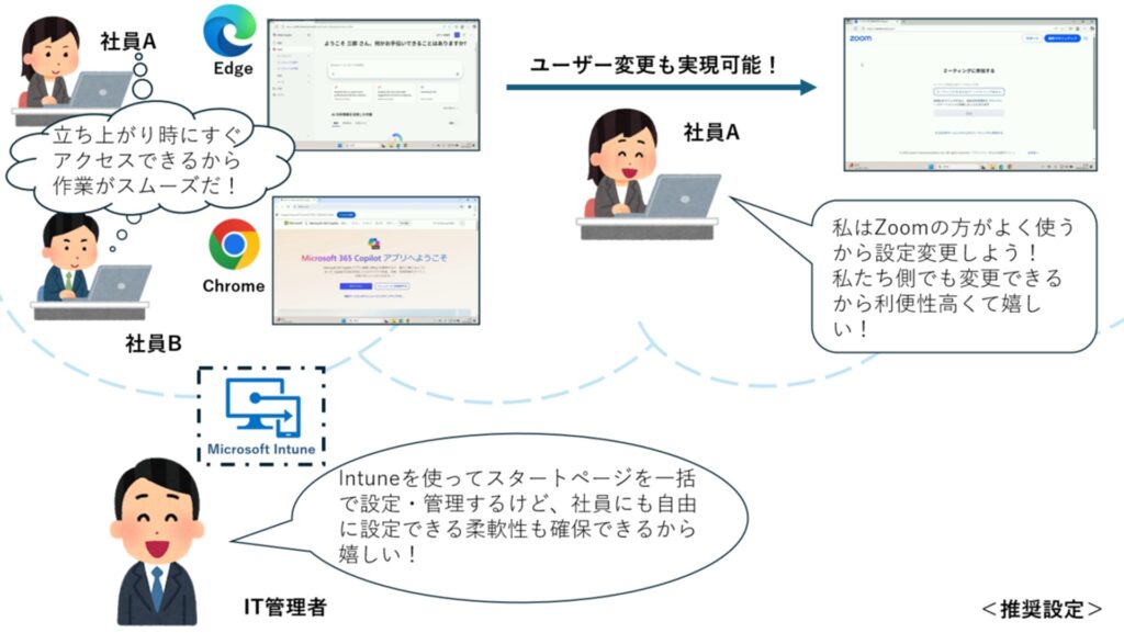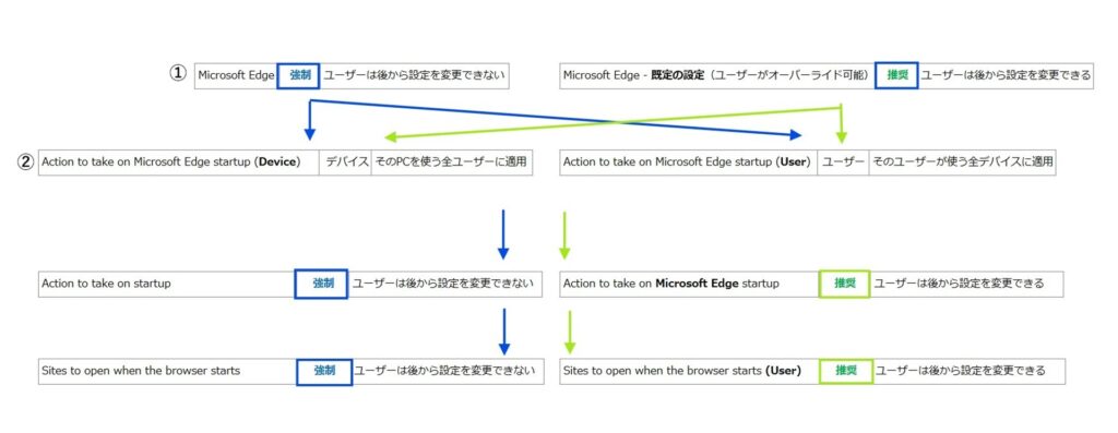 | Microsoft Edge – 既定の設定(ユーザーがオーバーライド可能) | 推奨 | ユーザーは後から設定を変更できる |