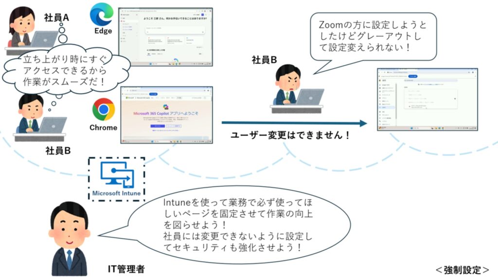 | Microsoft Edge | 強制 | ユーザーは後から設定を変更できない |