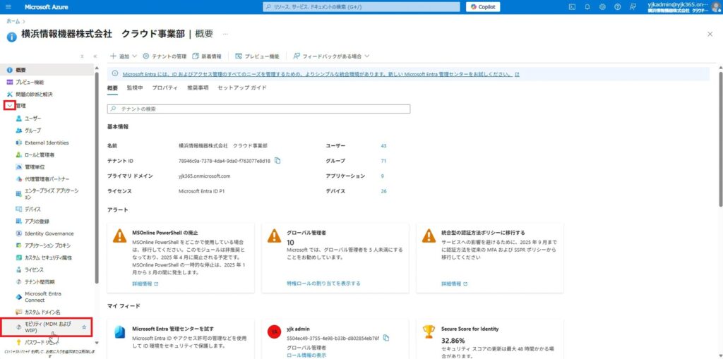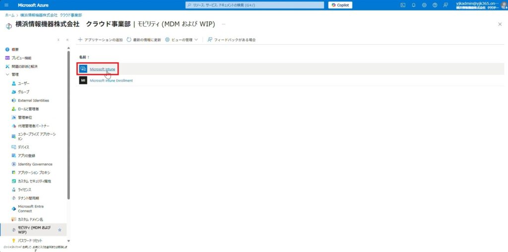 はじめに、Entra参加したユーザーが自動でMicrosoft Intuneへ登録されるようにするため、設定を行います。これによりMicrosoft Intuneによりデバイスの管理が可能になります。
