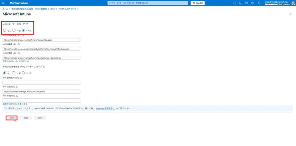 4. MDM ユーザースコープの項目から「すべて」を選択し、「保存」をクリックします。 これにより、Entra参加したユーザーは全てMicrosoft Intuneへ自動登録されます。
