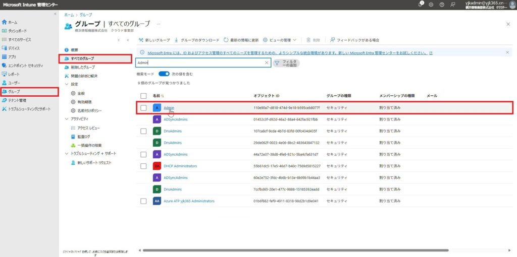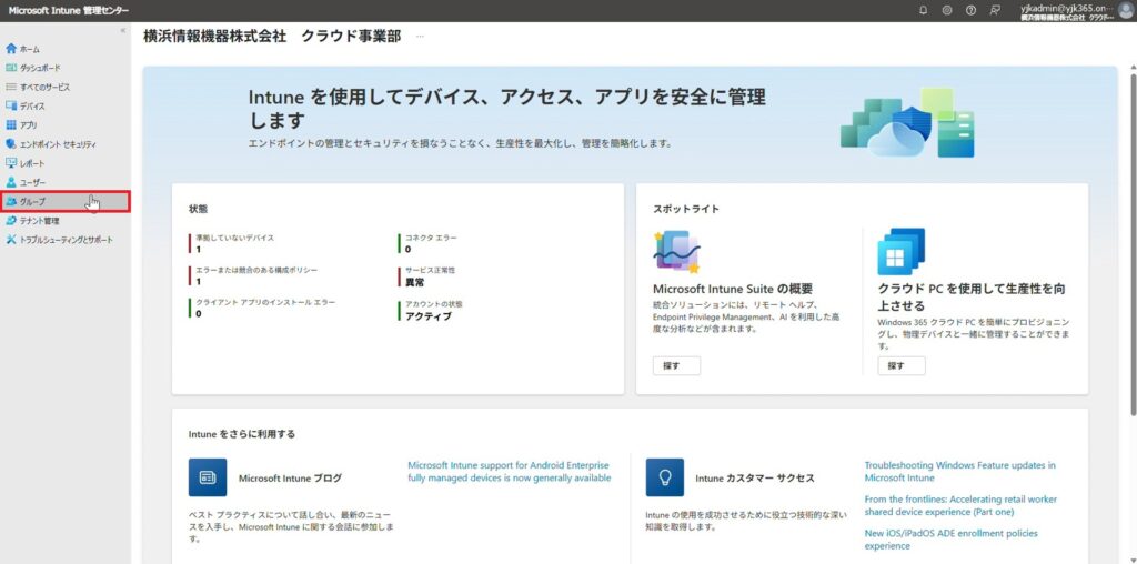 1. Microsoft Intune 管理センターを開き、「グループ」をクリックします。