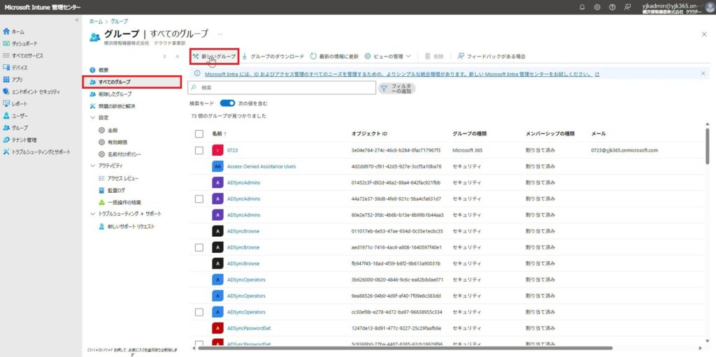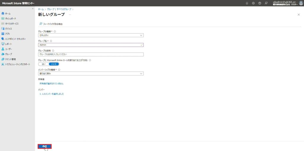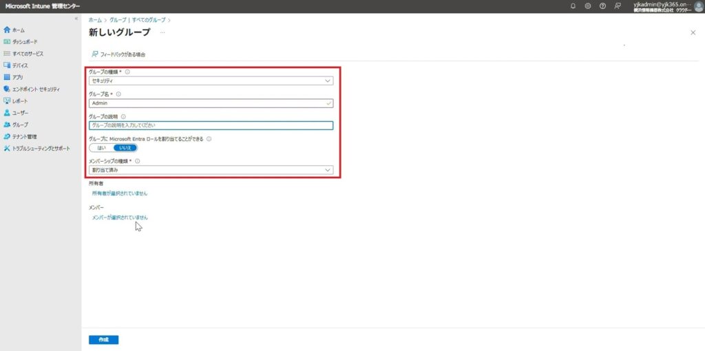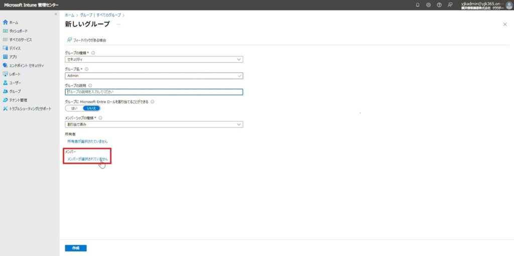 続いて、Entra参加を許可するメンバーを加えるためのグループを作成します。