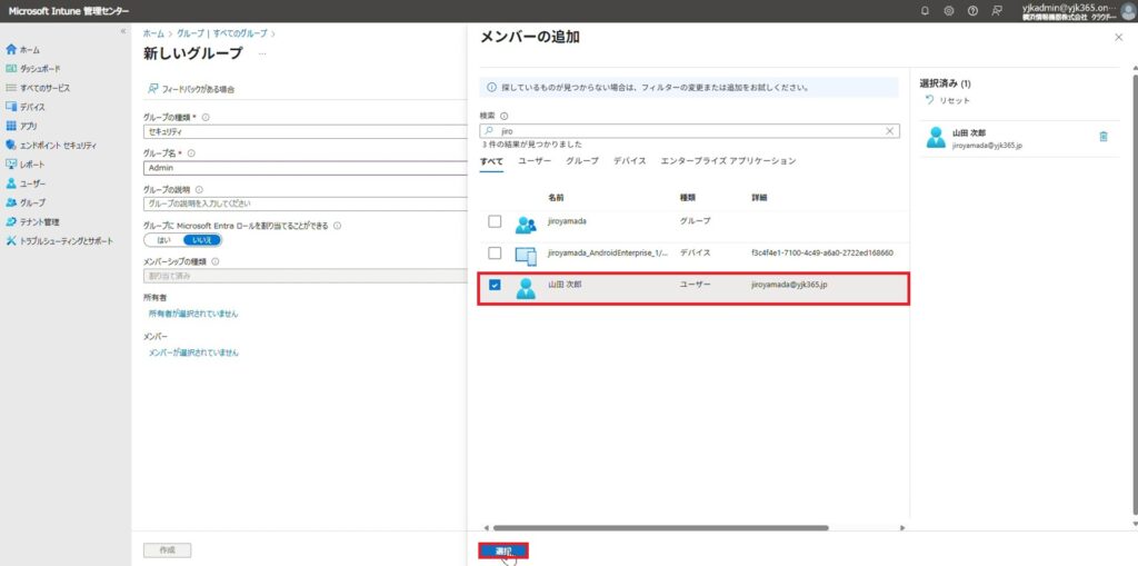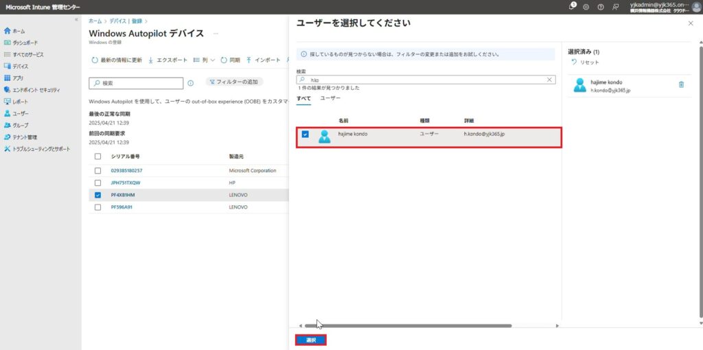 5.Entra参加を許可するユーザーにチェックを入れ、「選択」をクリックします。