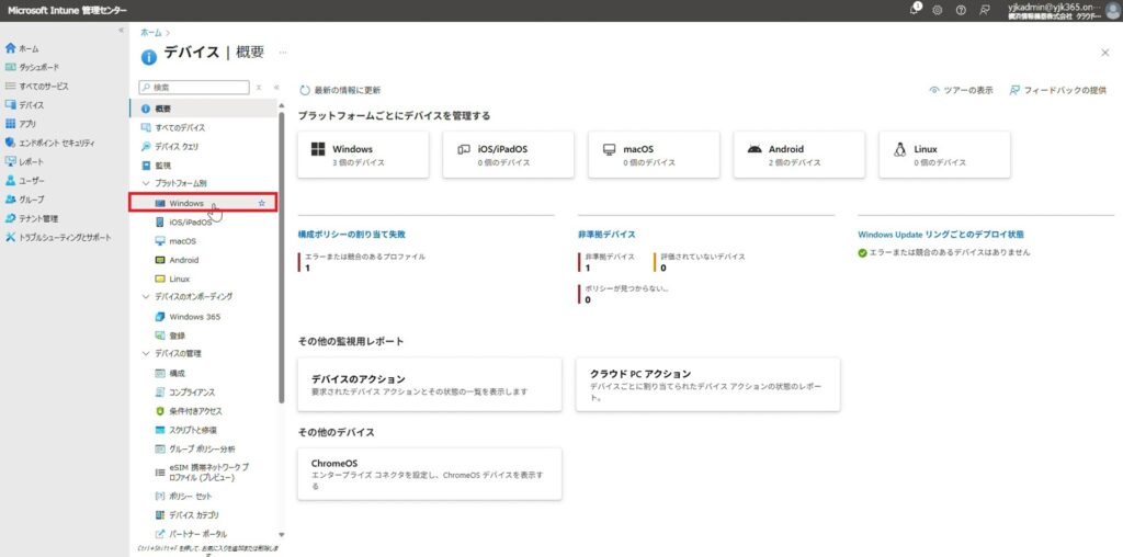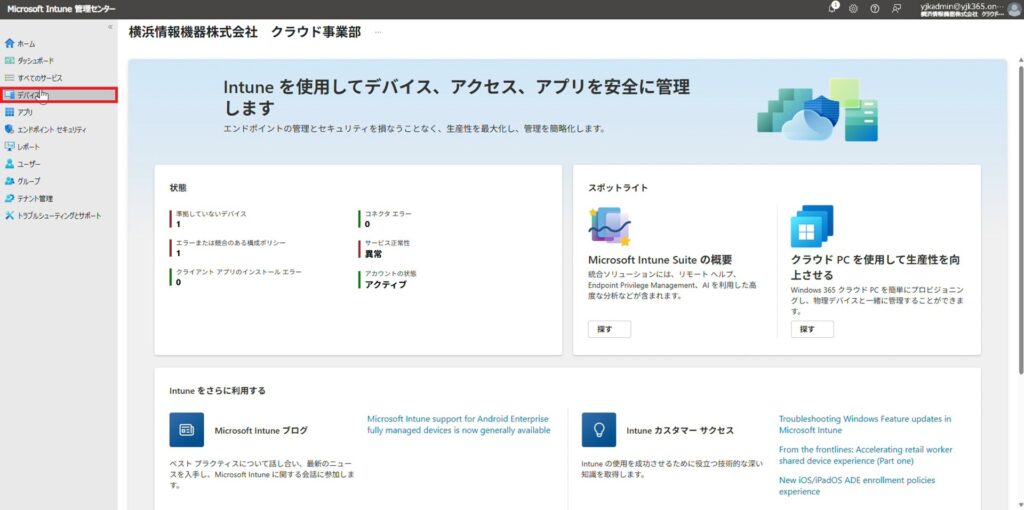 1. Microsoft Intune 管理センターを開き、「デバイス」をクリックします。
