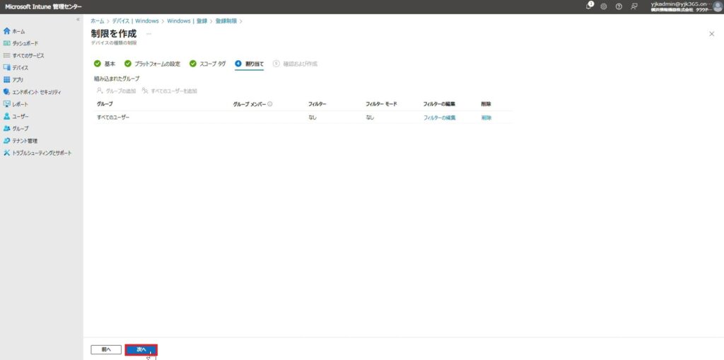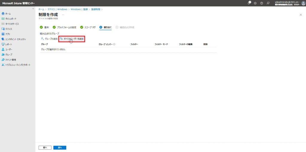 2.上記記事内の「ユーザーの追加>手順12」の画面で、Autopilotを行うデバイスにEntra参加が許可されていないユーザーを割り当てます。