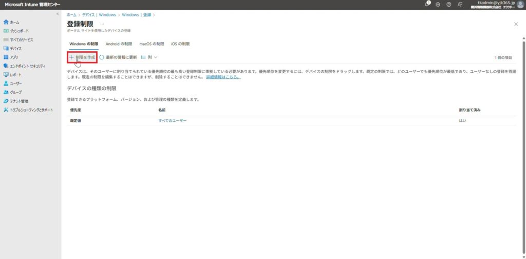 1.①全ユーザーを対象にEntra参加を制限の手順1~5と同様に「+制限を作成」をクリックします。