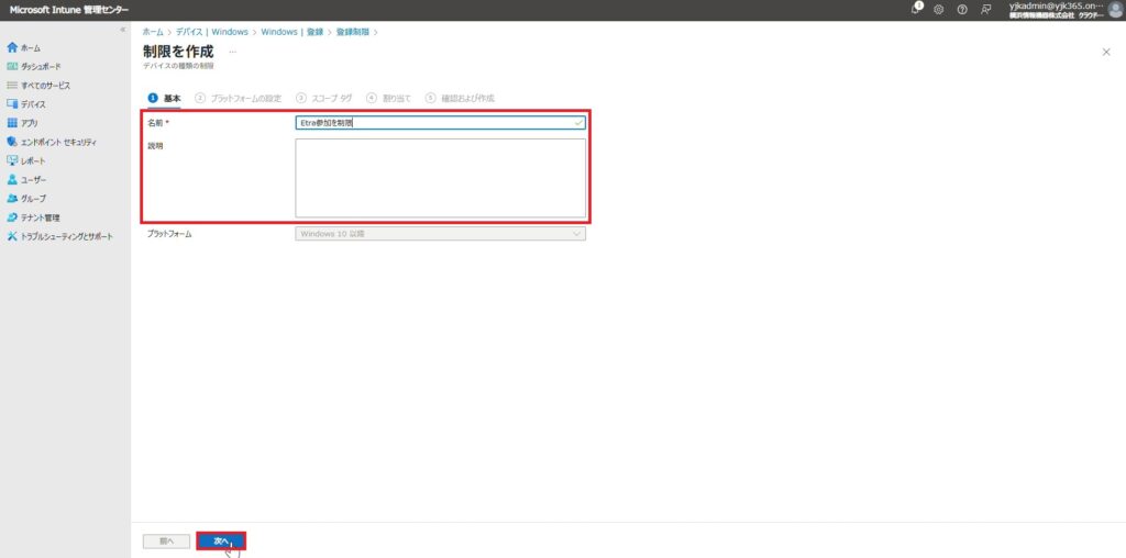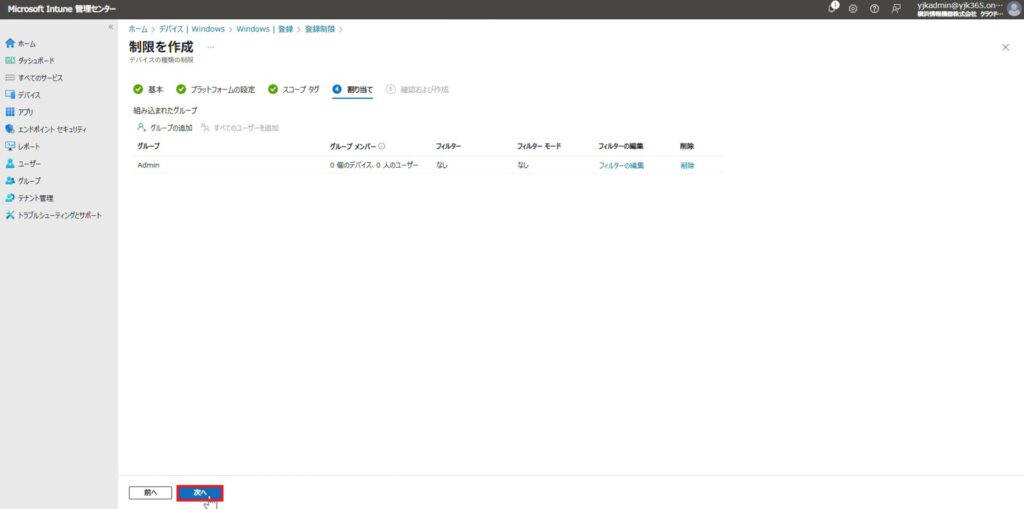4. Entra参加が許可されているグループに含まれていないユーザーのアカウントを入力し、「次へ」をクリックします。