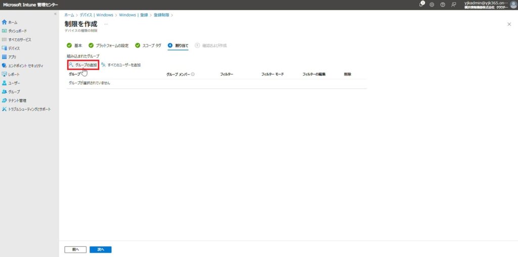 5.割り当てタブで「グループの追加」をクリックします。