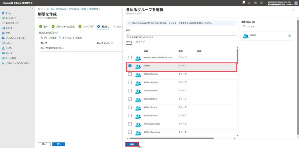 6.②Entra参加を許可するグループの作成で作成したグループにチェックを入れ、「選択」をクリックします。