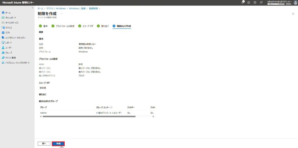 8.設定内容を確認し、「作成」をクリックします。