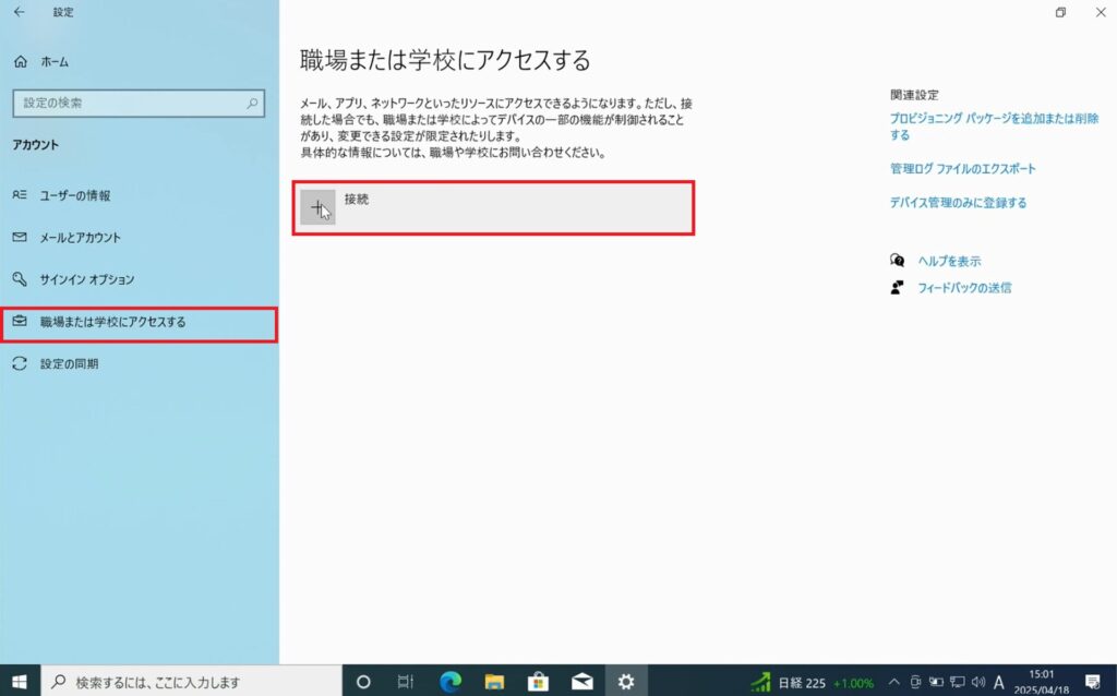 3.「職場または学校にアクセスする」を開き、「接続」をクリックします。