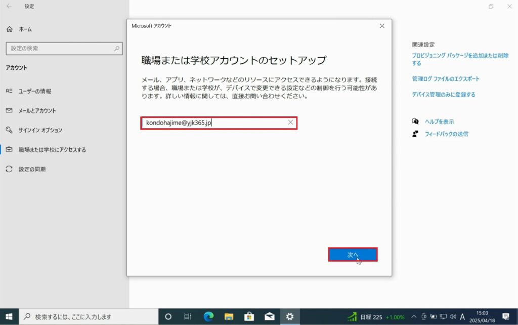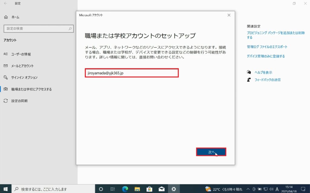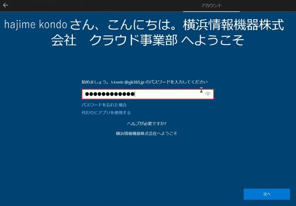 1.②Entra参加を許可するグループの作成の手順5で追加したユーザーのアカウントを入力し、「次へ」をクリックします。
