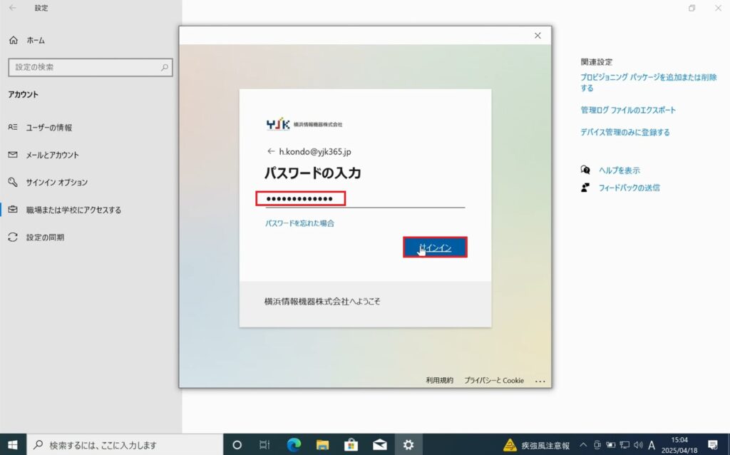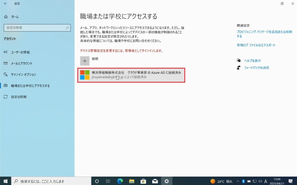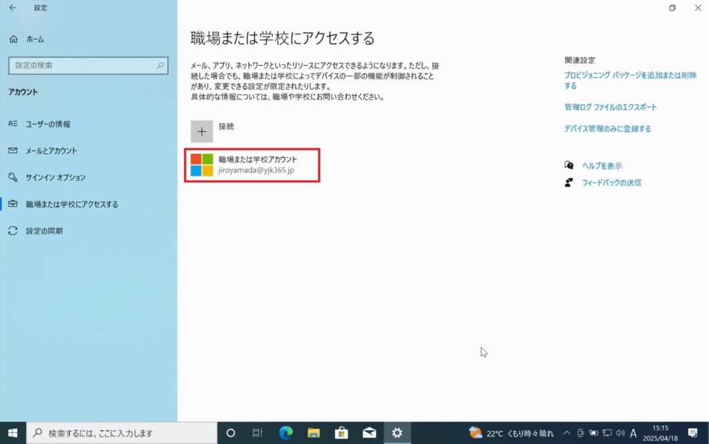 2.Windowsの設定を開き、AutopilotによりセッティングしたデバイスがEntra参加できていることを確認します。