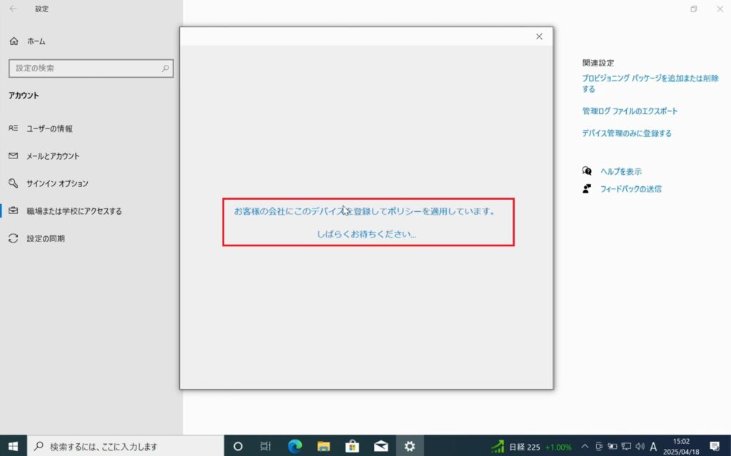 「お客様の会社にこのデバイスを登録してポリシーを適用しています。しばらくお待ちください」