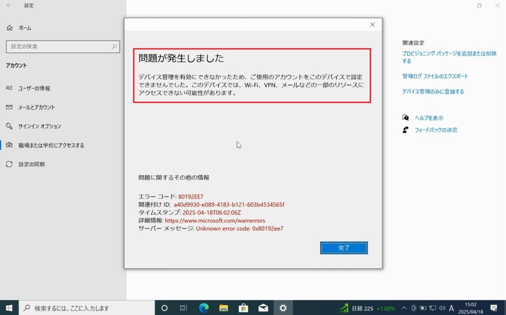 7.「問題が発生しました」と表示され、Entra参加に失敗しました。