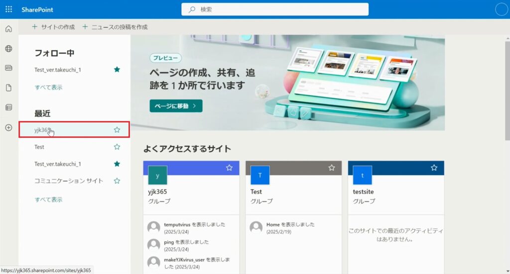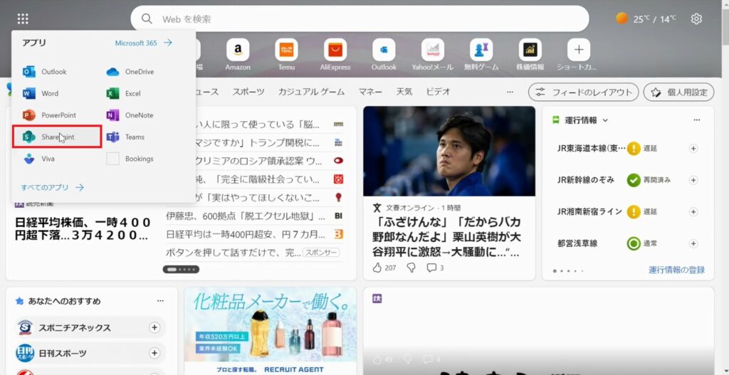 Microsoft Edgeを開き、SharePointを開きます。