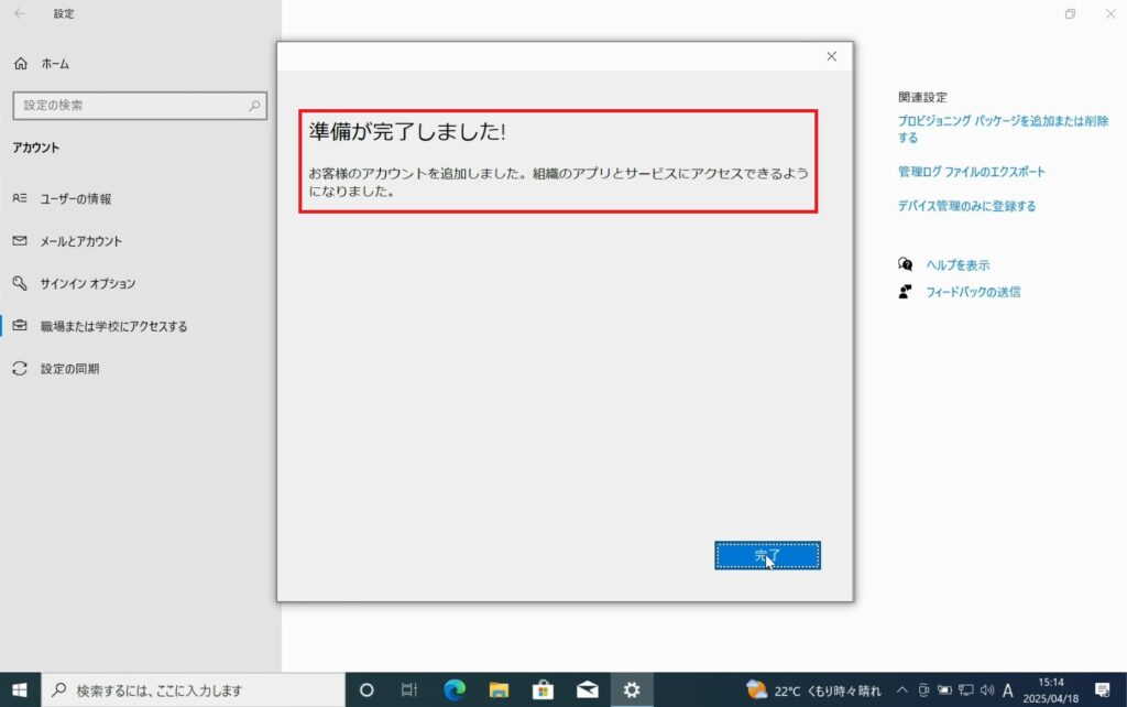 3.「準備が完了しました」と表示されEntra参加が成功しました。
