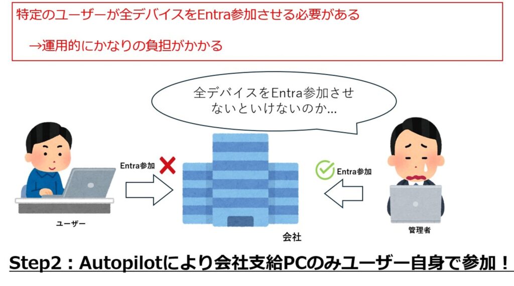 その回避方法として、Autopilotのユーザー駆動モードを採用する事で解決ができます。 Autopilotにより、社用デバイスをユーザーへ配布したあとで、ユーザー自身がテナントへの参加とIntuneへの登録ができるよう権限委譲できます。