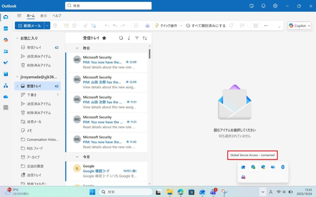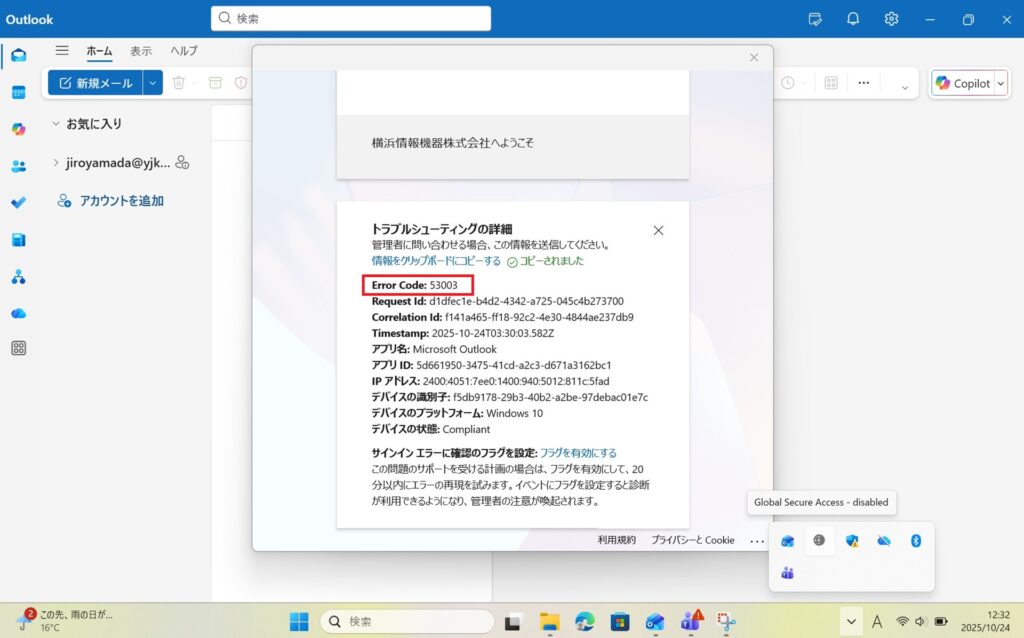 ・Outlookでは、GSAを無効にしても、Outlookを閉じない限りは利用ができました。しかし、Outlookを一度閉じると、アカウントのサインインを求められ、制御ができました。