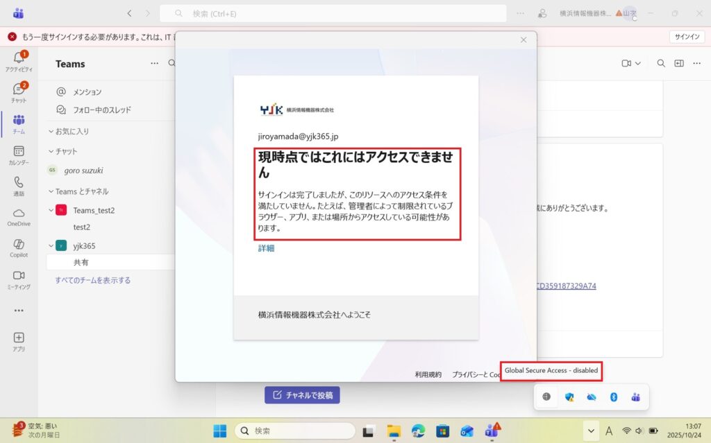 ・Teamsでは、GSAを無効にしても、普段通り使い続けることができました。また、サインイン頻度を設定することで、写真のようにサインインを求められますが、サインインをしなくても利用できてしまうため、意味がありませんでした。