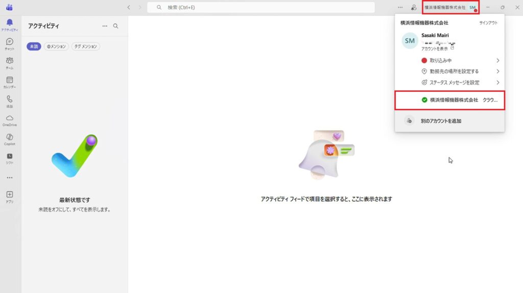 ・Teamsの右上のアカウントをクリックから、他の外部テナントが確認できます。
