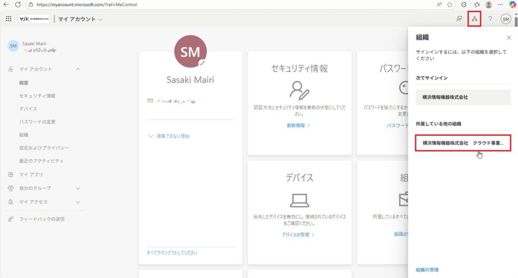 1.マイアカウントより、右上の「組織」マークをクリックし、「所属している他の組織」に表示されている、切り替えるテナントをクリックします。