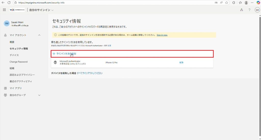 3.「+サインイン方法の追加」をクリックし、新しいデバイスで「Microsoft Authenticator」を登録します。この後の手順は1-8から一緒です。