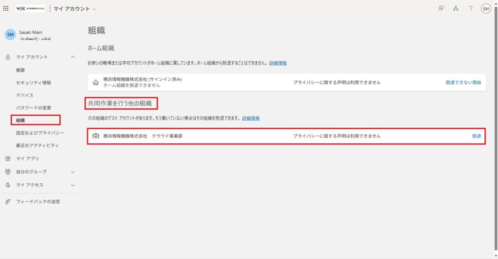 ・マイアカウントより、「組織」をクリックして「共同作業を行う他の組織」に外部テナントが確認できます。