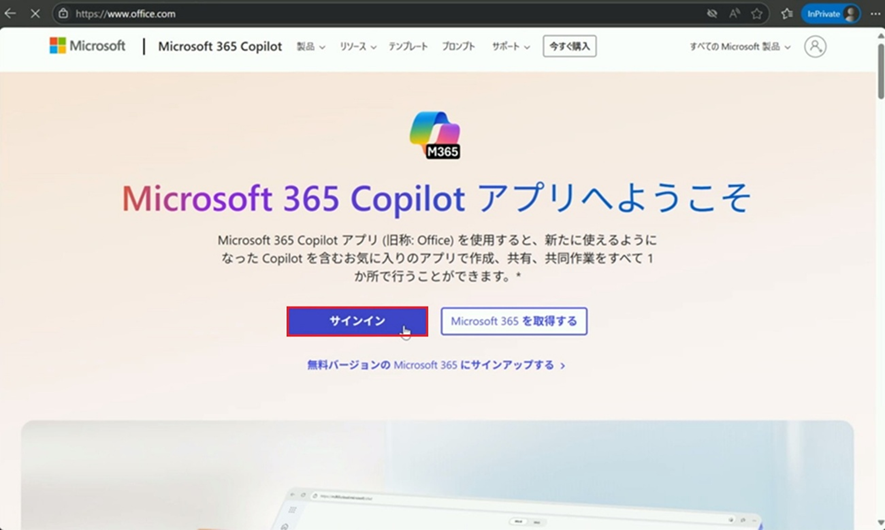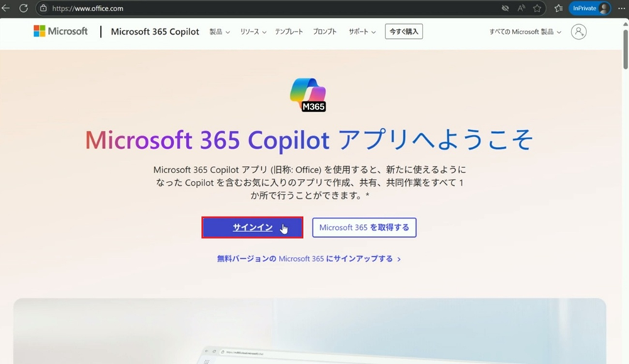 1.「https://www.office.com」にアクセスし、「サインイン」をクリックします。