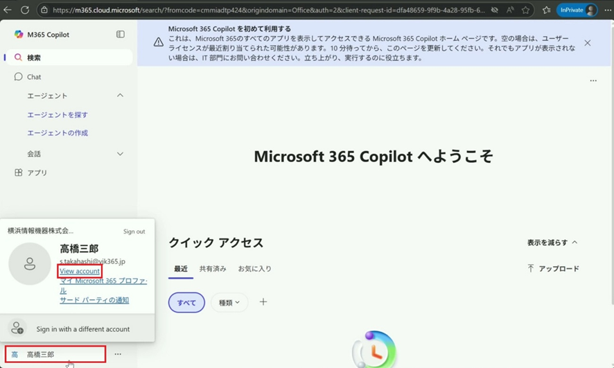 5.画面左下の「ユーザー名」をクリックして、「View account」をクリックします。