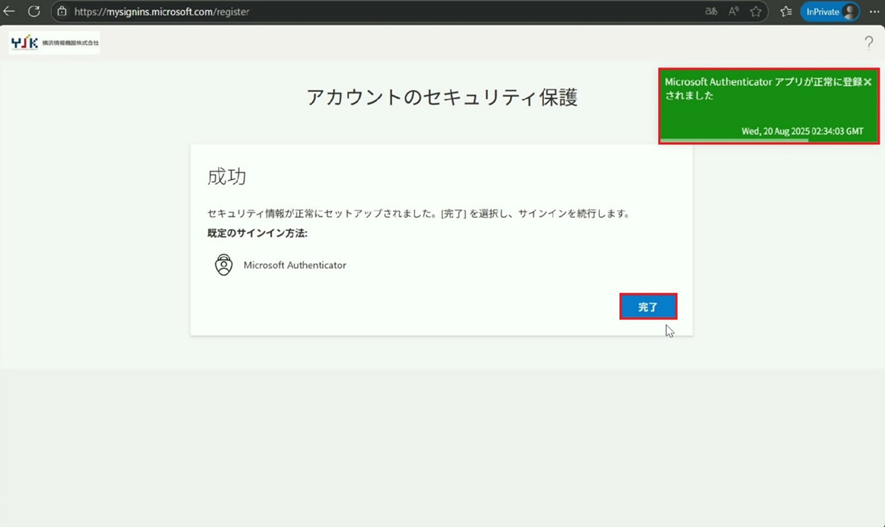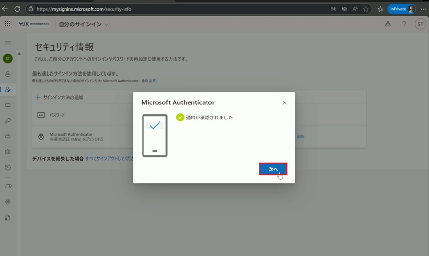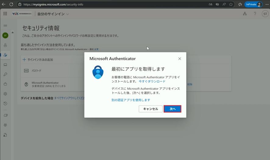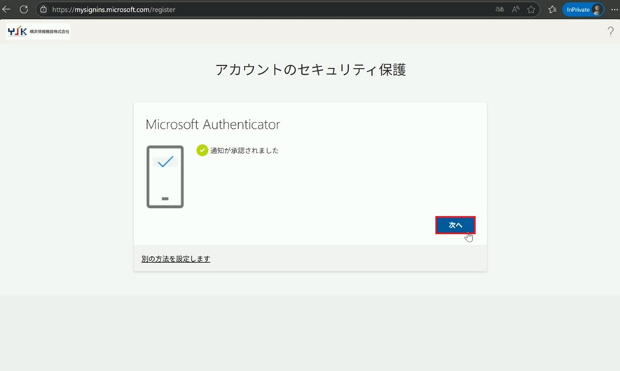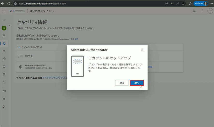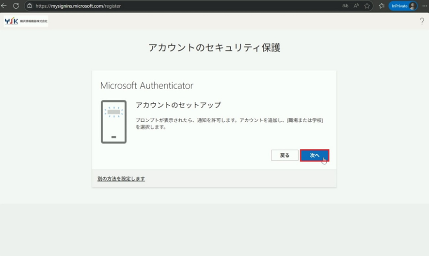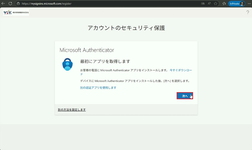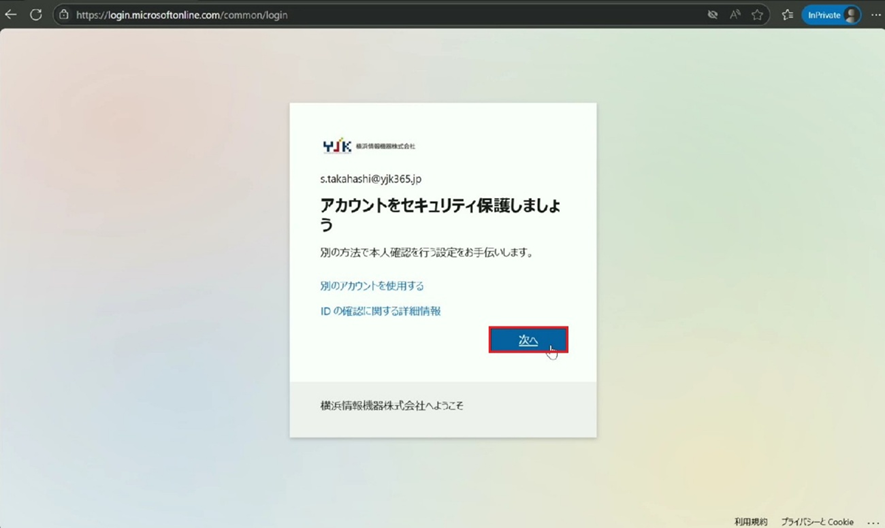 7.「アカウントをセキュリティ保護しましょう」と認証の再登録が要求されるため、「次へ」をクリックします。