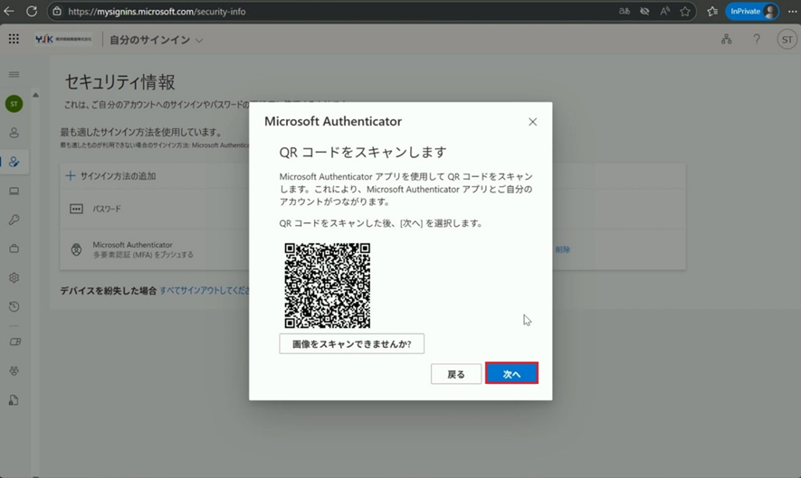 10.新しいスマホのAuthenticatorアプリで、表示されたQRコードを読み取り、「次へ」をクリックします。