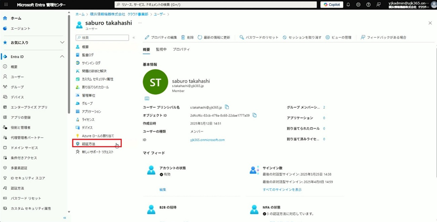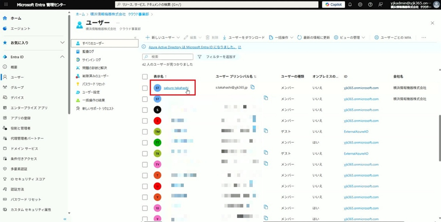 1.Microsoft Entra 管理センターを開き、「ユーザー」から、再登録を要求するユーザーを選択します。