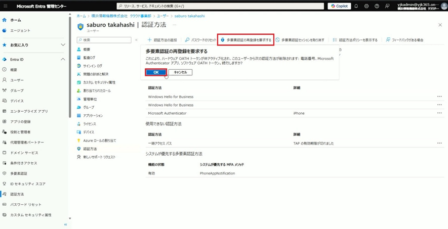 3.「多要素認証の再登録要求する」をクリックし、「OK」をクリックします。