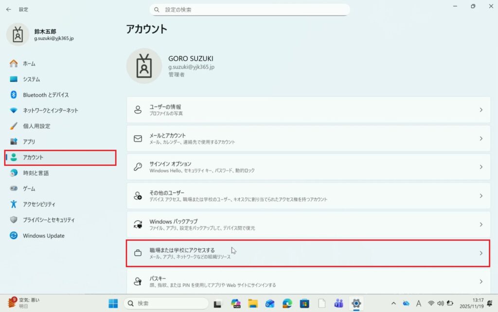 「設定」を開き、「アカウント」をクリックし、「職場または学校にアクセスする」をクリックします。