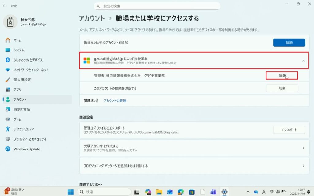 16.「~ によって接続済み」を開き、「情報」をクリックします。