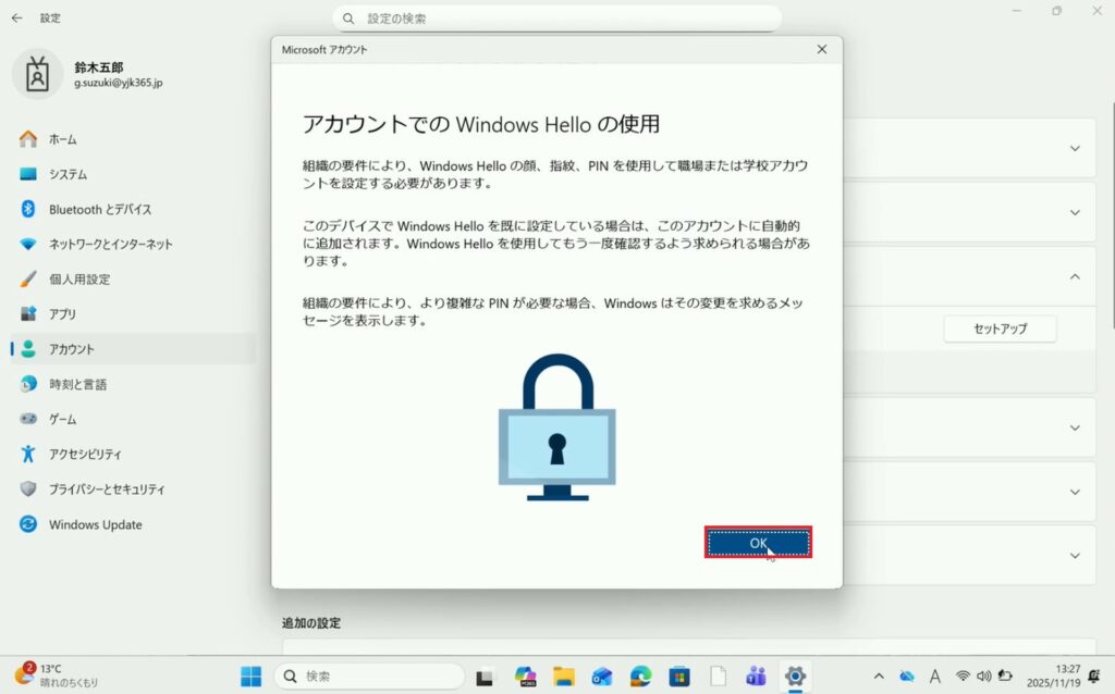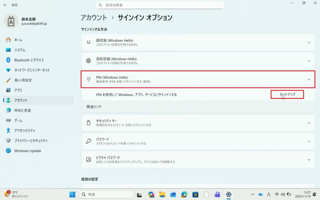 20.「PIN(Windows Hello)」を開き、「セットアップ」をクリックします。