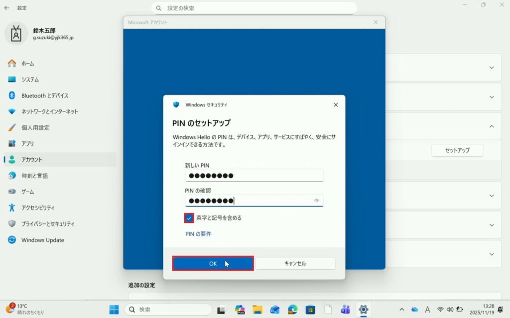 26.「英字と記号を含める」にチェックを入れ、PINを入力し「OK」をクリックします。