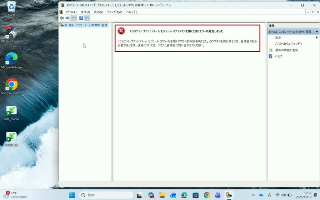 管理者権限があるユーザーでないと、TPMのクリアが実行できません。